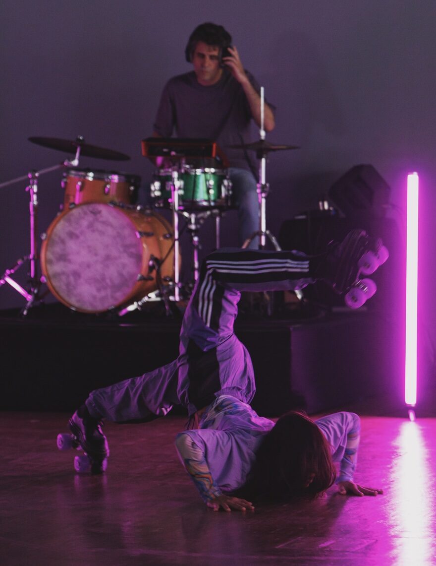 Performance pour rollers et batterie, DESORDEN nous entraîne dans un rite hypnotique traversé par un désordre libérateur. Justine Berthillot roule, chute, défie l’équilibre comme une marionnette en transe guidée par le son. Avec elle, Xavier Roumagnac impulse une musique électro et percussive, portée par une batterie vibrante et une énergie brute.